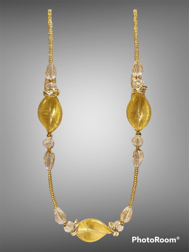 Collana lunga in vetro di Murano eseguita con la lavorazione “sommersa” e montata con conterie e cristalli. Le parti metalliche sono senza nichel a norma di legge.