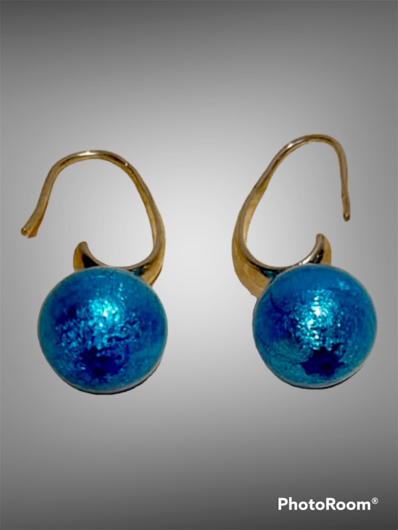 Orecchini in vetro di Murano eseguiti con la lavorazione “sommersa” e montati con conterie e cristalli. Le parti  metalliche sono senza nichel a norma di legge.